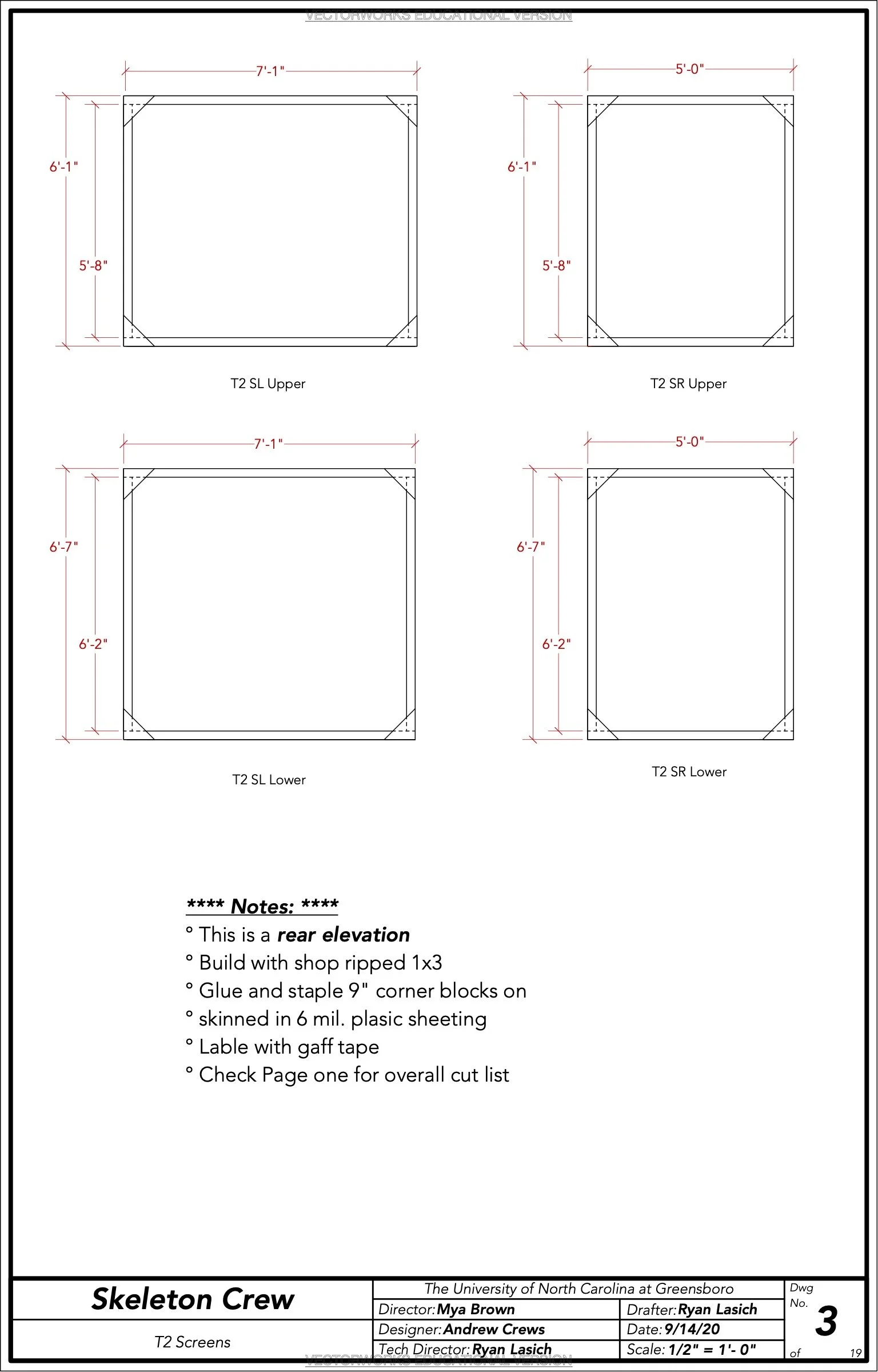 The first project was the sets of shadow screens that wrapped the scaffolding. I opted for construction grade plastic sheeting to allow the open skeletal framing my designer was after because muslin would need much more than a set of rails, stiles, and some corner blocks. It also added to the industrial look of the show and saved money. Getting the plastic taut across the frame without stretching or puncturing it was challenging, but a welcome challenge nonetheless. We attached screens to the scaffolding using plumbers strap. Below are my draftings for the screens, including a key I made for the production team to help keep the various scaffolding units straight. Click to enlarge.